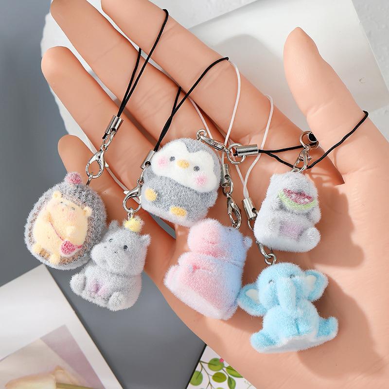 Fun Cartoon Flocking Animal Keychains Phone Lanyard Resin Cute Hexagonal Hedgehog Hippos Bag Earphone Case Pendant Girls Gift