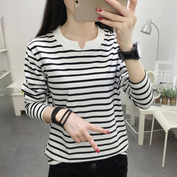 Plus Fat Plus Size Loose Long-sleeved T-shirt Women's Autumn Clothes Pure Cotton Bottoming Shirt Outer Wear Black and White Striped Top