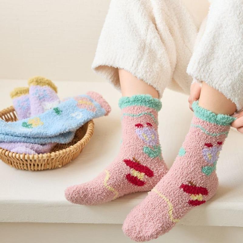 Autumn and Winter Coral Fleece Socks, Women's Small Flower Fruit Thickened Warm Socks, Women's Home Floor Socks, Postpartum Mid-calf Socks