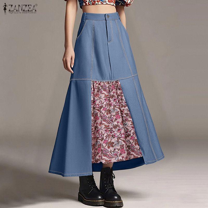 ZANZEA Women Print Patchwork Loose Casual A-line Long Skirts