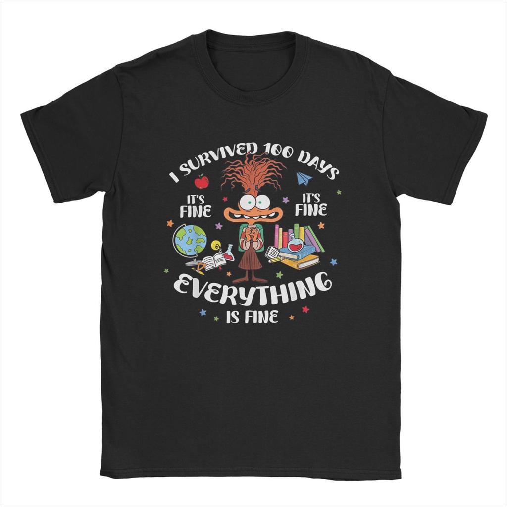 Inside Out I Survived 100 Days Of School T Shirts Men's Cotton Funny T-Shirt Round Collar Anxiety It's Fine Tees Clothes Classic