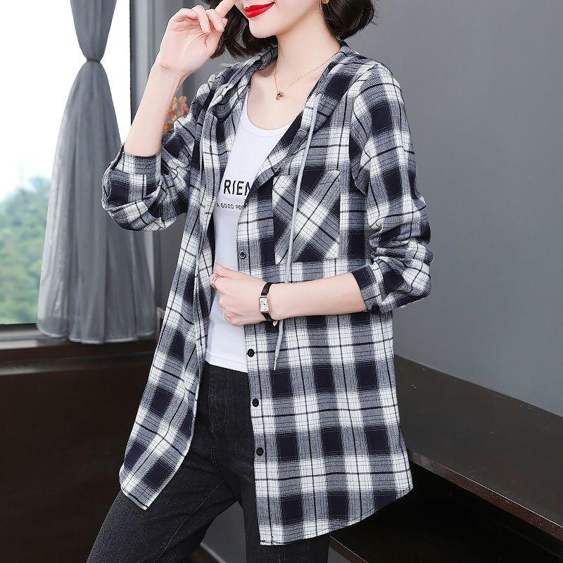 Women's Spring and Autumn 2025 New Stitched Hooded Button Lace Plaid Fashion Versatile Casual Long Sleeve Shirt