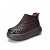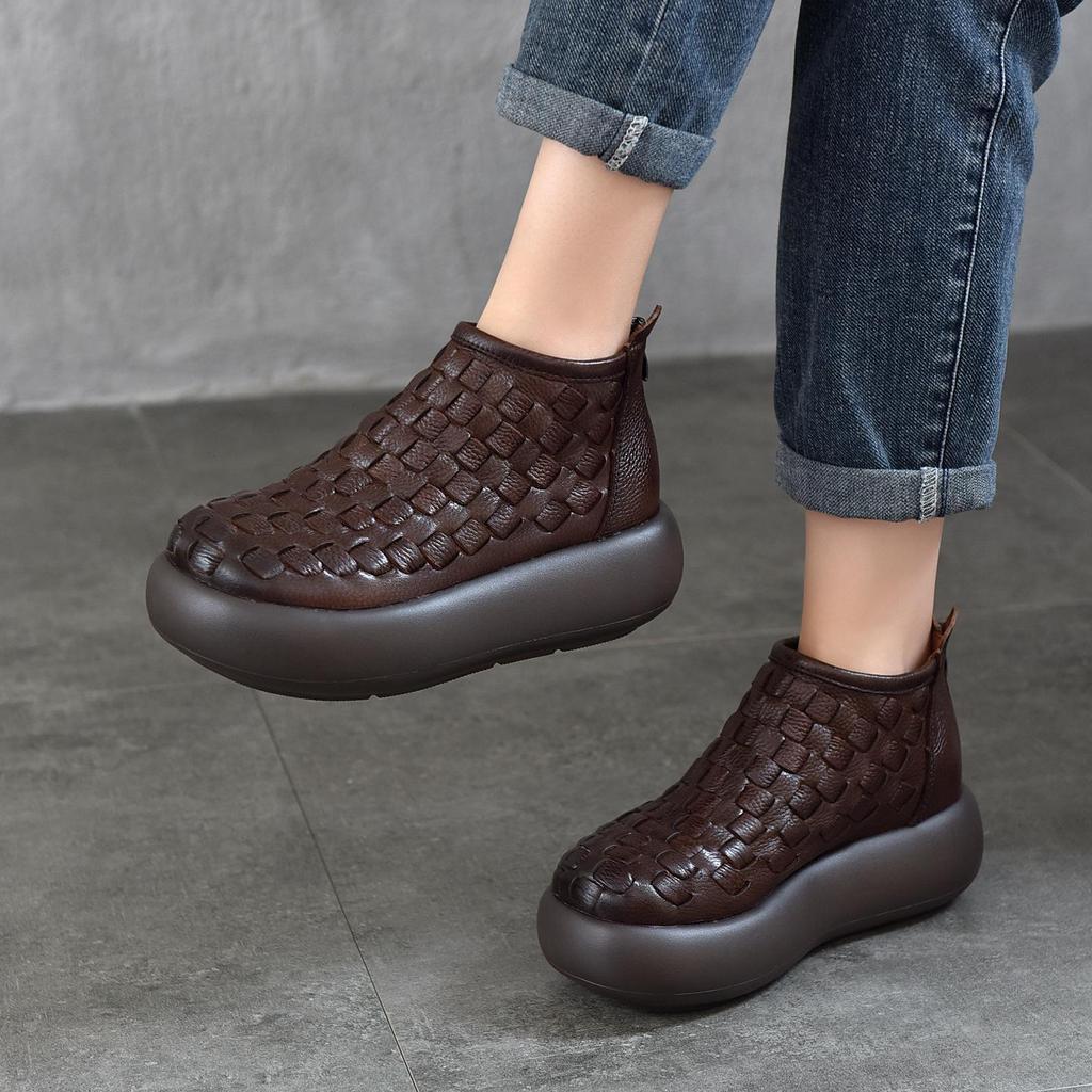 Experience timeless style with these handmade genuine leather platform ankle boots, designed for women who appreciate a blend of classic and modern fashion. Featuring a unique 2025 design, these boots boast a thick knitted sole for added comfort and durability. Crafted from first-layer cowhide, they offer a luxurious feel and exceptional quality. Ideal for cooler seasons, the boots are lined with soft cotton, ensuring warmth and comfort with every step. Perfect for making a fashion statement while embracing functionality.