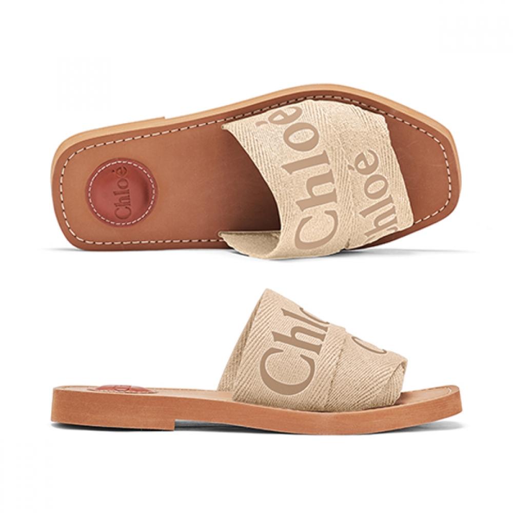 This product is a flat mule slipper from the French fashion brand Chloé, with the model name CHC23U188EF 26Y. The Woody logo is prominently applied, emphasizing the brand's unique heritage. It is suitable for honeymoon trips, leisure wear, and casual habits at home.