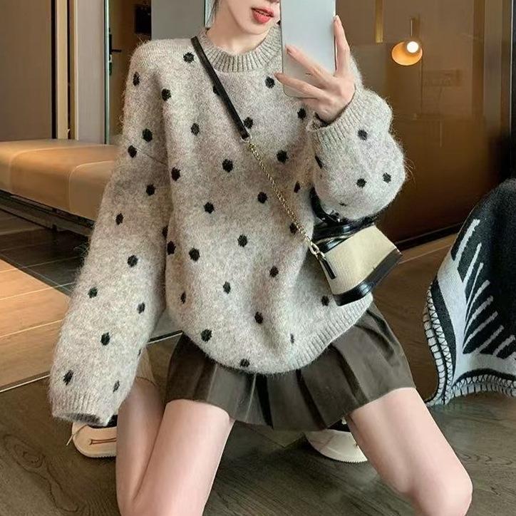 Round-neck Pullover Loose Polka Dot Knitted Sweater for Women's New Autumn and Winter Laid-back Style Retro Sweater