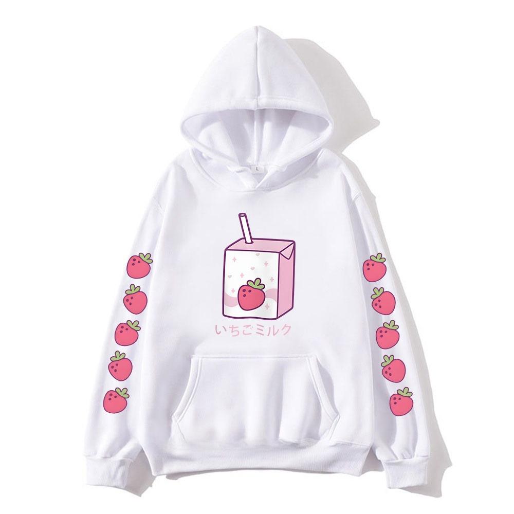 Strawberry Milk Cartoon Printing Hoodies Long Sleeve Hooded Sweatshirts Kawaii Clothing for Girls Moletom Feminino Winter Women