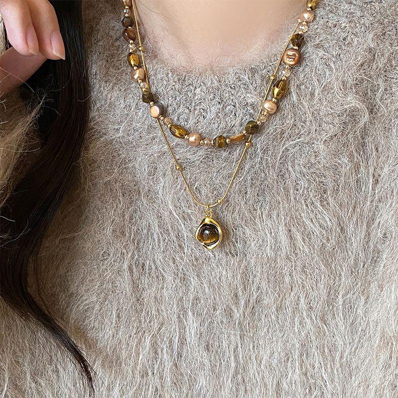 Retro Tiger's Eye Stone Natural Stone Beaded Necklace Set Women's New Light Luxury Fashion Collarbone Chain Temperament Sweater Chain