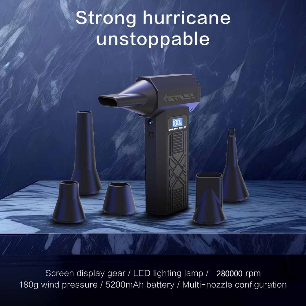 Good luck with your favorite purchasesFeatures:High quality components:This mini turbo jet fan adopts super high-quality imported high-speed bearings, a new CNC metal turbine, a brushless motor, and a hand wound motor.Super strong wind speed:The machine has four shark gills that actively dissipate heat through air vents, effectively expelling hot air from the cabin, providing protection for long-lasting operation.Portable and compact:With its mini size and lightweight design, it is very convenient to carry. The compact body of the turbo frenzy fan makes it easy to carry and easy to use outside.Long battery life wireless design:His powerful hair dryer is equipped with built-in capacity 5200mah batteries, which can achieve wireless operation without external power supply. Enjoy the convenience of long-lasting use.High quality structure:Pocket style: Wireless design, fashionable and exquisite. The TYPE-C charging interface supports 10W fast charging, with a compact size that is easier to operate than a single hand, ensuring fast and efficient charging.Easy to use operation:Knob stepless speed regulationThe user-friendly design of portable turbo fans ensures easy functionality. In addition, the charging board also has safe and reliable charging protection and overheating protection functions. The internal brushless motor can achieve high speeds of up to 280000RPM (revolutions per minute).Wide Usage:Air cushion blowing and suction, computer equipment cleaning, industrial dust blowing, charcoal burning to support combustion, car blowing and snow blowing, film studio shooting and wind making, drying pets, and many other uses.