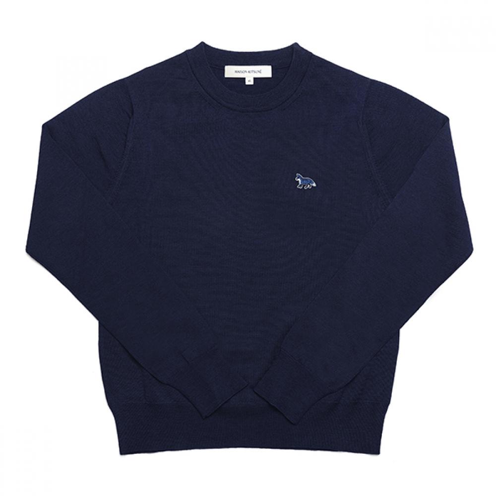 The Maison Kitsuné MW00816KT1036 P492 Baby Fox Patch Women's Knit is crafted from soft knit fabric and designed for women. Featuring a distinctive baby fox patch on the front, this item offers comfortable wear and can be styled from casual to semi-formal looks. With a crew neck design and long sleeves, it emphasizes feminine silhouettes and comes in options for slim and regular fits.