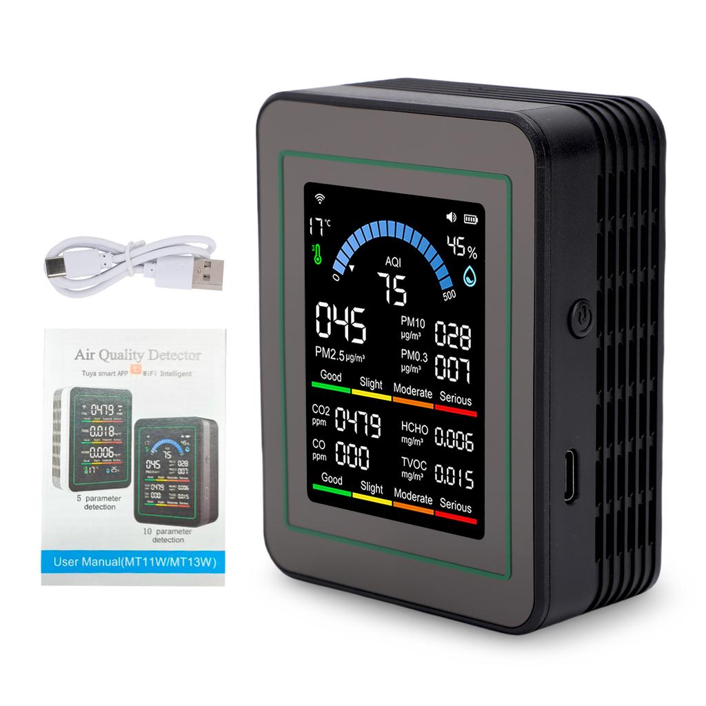 1. 10 Monitoring Functions: This 10 in1 air quality monitor detects CO₂, temperature, humidity, HCHO, TVOC, PM2.5, PM10, PM0.3 and other air quality indicators. Widely used in homes, offices, classrooms, hotels, etc., it fully cares for your breathing health, making living environments more secure.