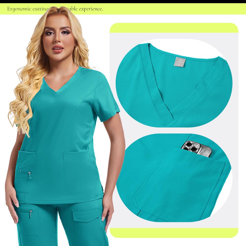 This scrub suit set is designed specifically for professionals in the healthcare and spa industries, featuring a stylish V-neck design. Made from high-quality polyester, it ensures comfort and durability throughout your busy workday. The fabric is both lightweight and breathable, making it ideal for long hours of wear while maintaining a polished appearance. Perfect for nurses, beauticians, and other service professionals, this scrub suit combines functionality with a modern look.