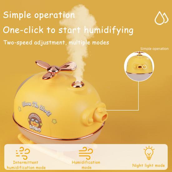 The dual-function LED night light adds a soft glow, creating a cozy atmosphere ideal for nurseries or self-care spaces. Designed with a charming duck pilot theme and a rotatable propeller, it doubles as an adorable decorative piece. Equipped with a built-in 1200mAh rechargeable battery and USB charging, this portable humidifier is perfect for use anywhere. A thoughtful gift for all ages, it helps relieve dryness and enhances relaxation wherever you go.