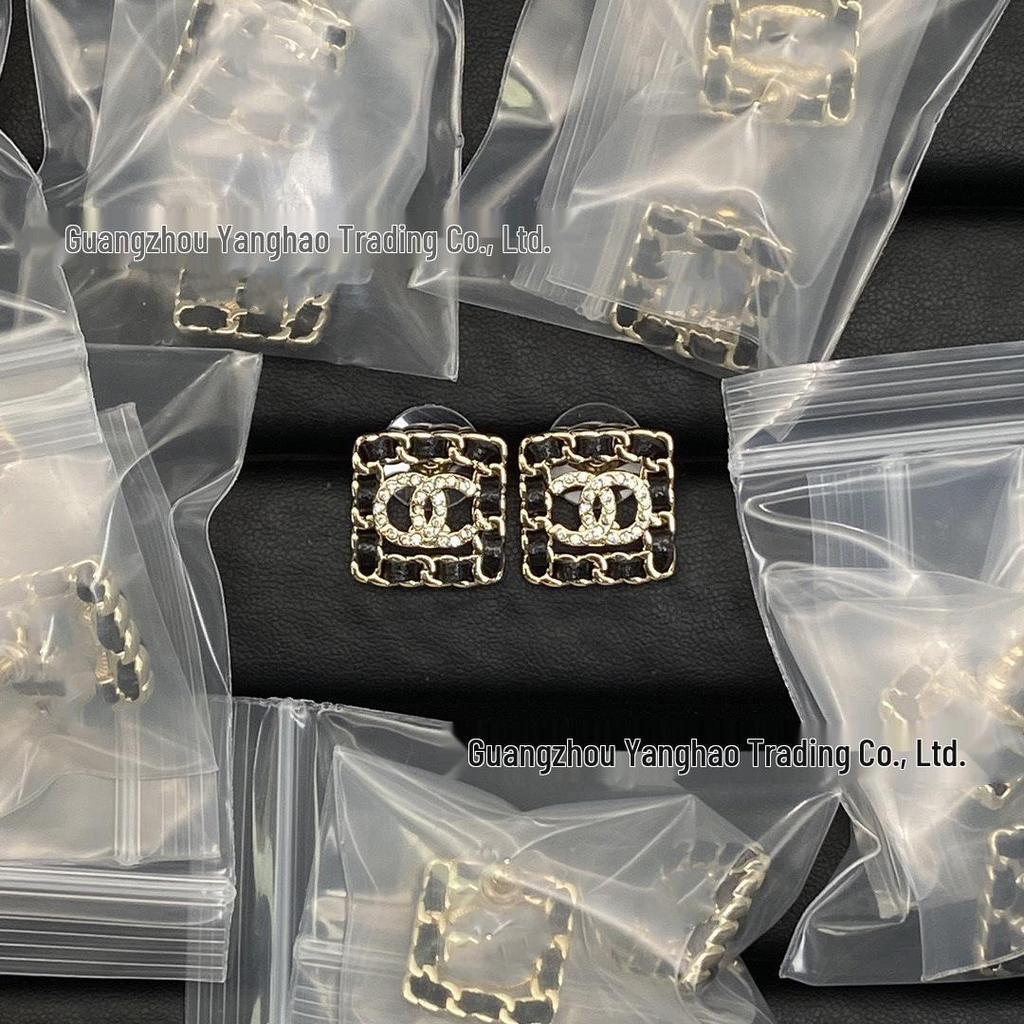 Seiko Coco Style Women's Square Black Leather Stud Earrings with Full Diamond Double C Design
