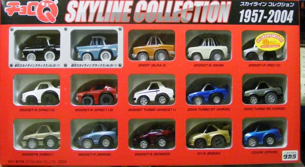 The Skyline, born in 1957 and still immensely popular with a wide range of generations, is now available in Choro-Q, featuring a complete set of Skylines from the original to the 11th-generation V35 model, released in 2001. This set includes 15 cars in total: two originals, a Skyline Sports, an S54, two Hakosukas, a Kenmeri, a Japan, two Newmans, a 7th generation, an R32, an R33, an R34, and a V35.