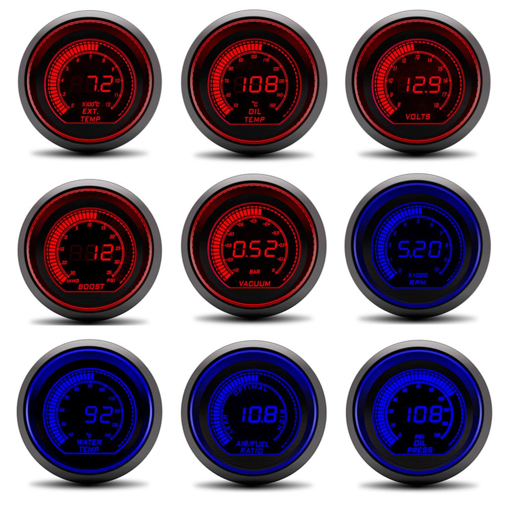52mm Boost Gauge Tachometer Volt Water Oil Temp Oil Press Vacuum Air Fuel Ratio Exhaust Temp Digital Red Blue Dual Color Meter