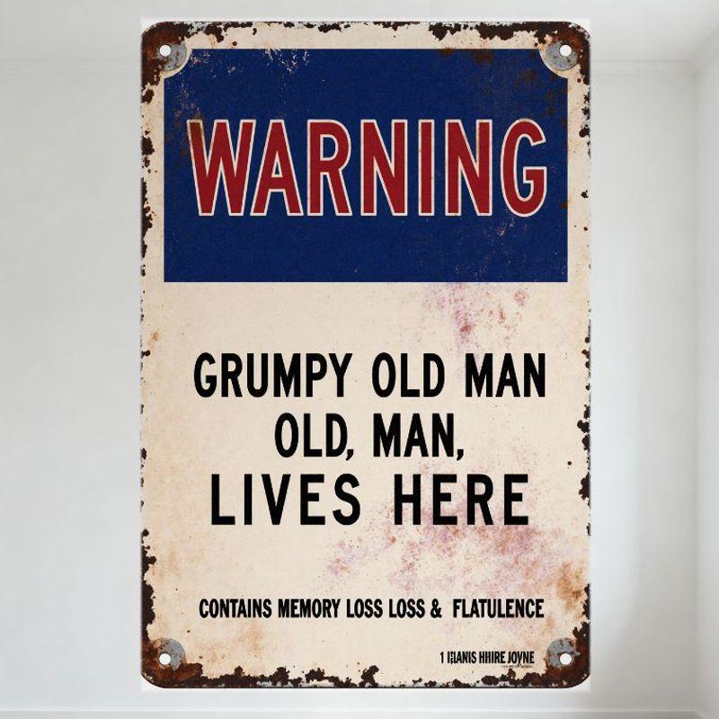 Vintage Grumpy Old Man Warning Metal Tin Sign - Distressed Rusty Blue White Warning Plaque with 'MEMORY LOSS & FLATULENCE' for M