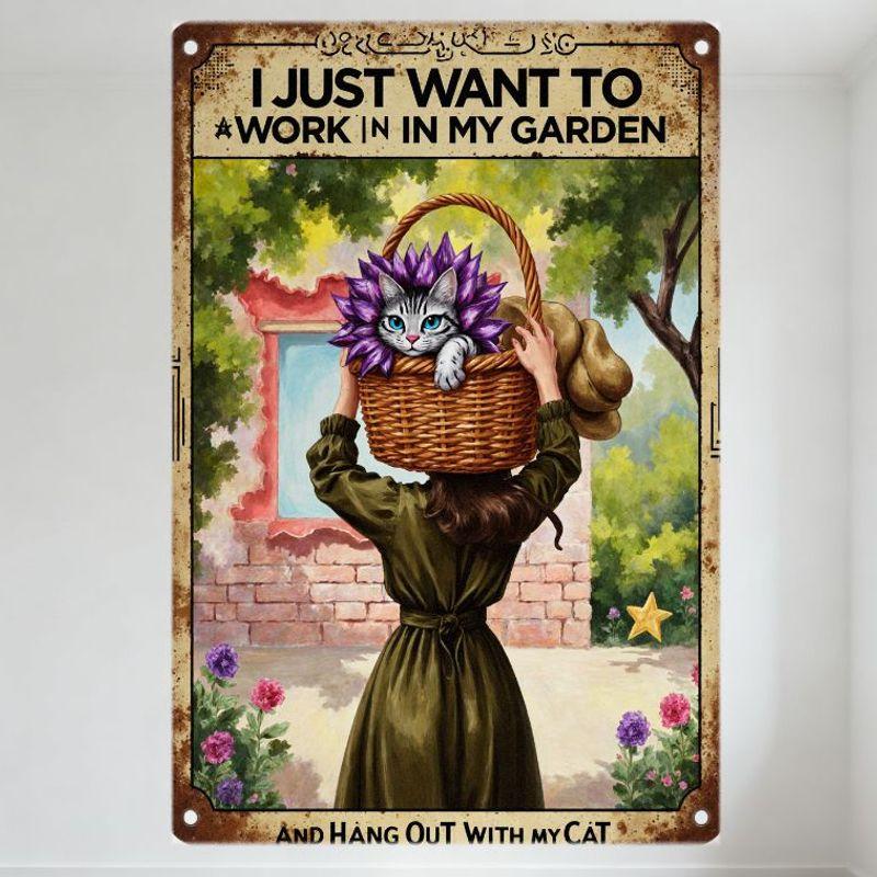 Vintage Whimsical Metal Sign Woman with Cat In Garden 'I JUST WANT TO WORK IN MY GARDEN' and 'AND HANG OUT WITH MY CAT' for Home