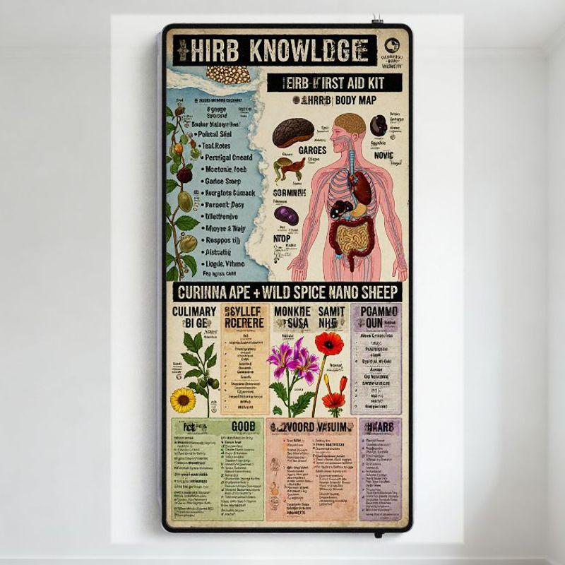 Vintage 'HIRB KNOWLEDGE' Educational Tin Sign Retro First Aid Body Map Medical Poster with Plant Substances Illustration Home De