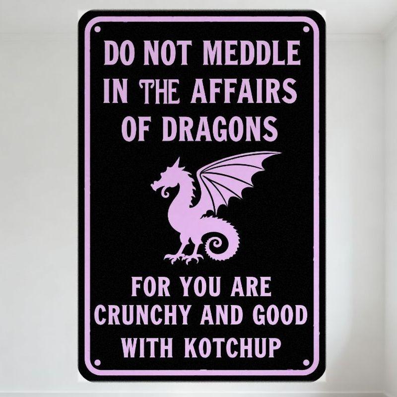 Funny Dragon Metal Tin Sign Black Rectangular with White Border Rounded Corners Pink Dragon Illustration DO NOT MEDDLE In Affair
