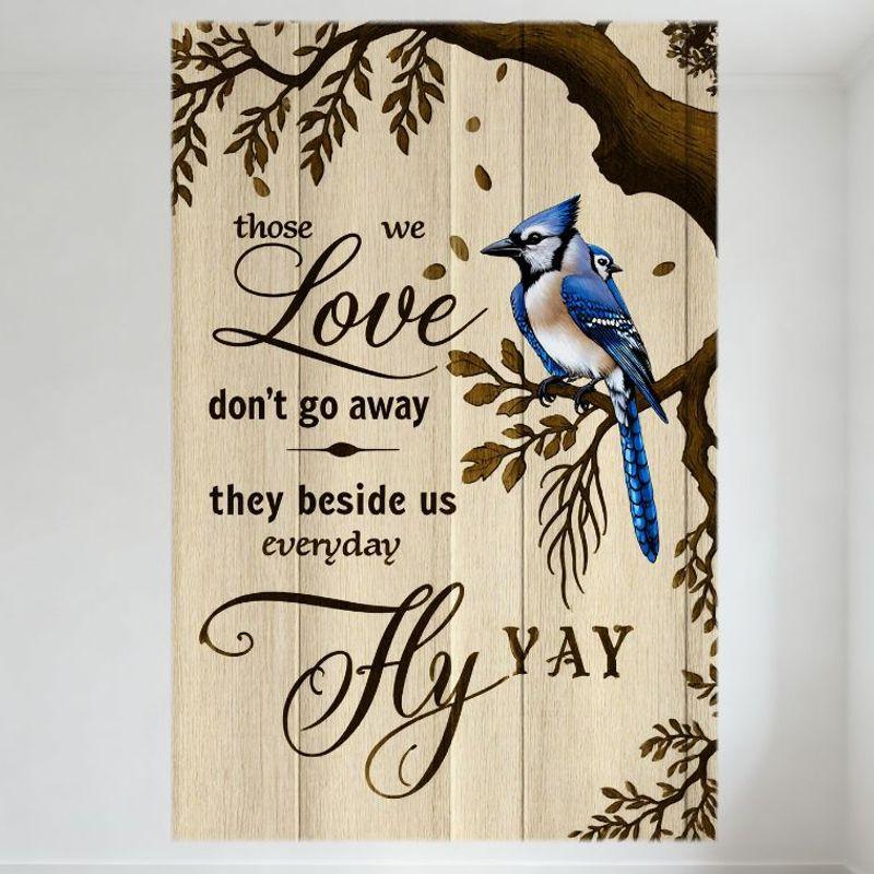 Wooden Planks Background Blue Jay Tree Branch Metal Tin Sign 'Those We Love Don't Go Away' Inspirational Quote Wall Art Decor Fo