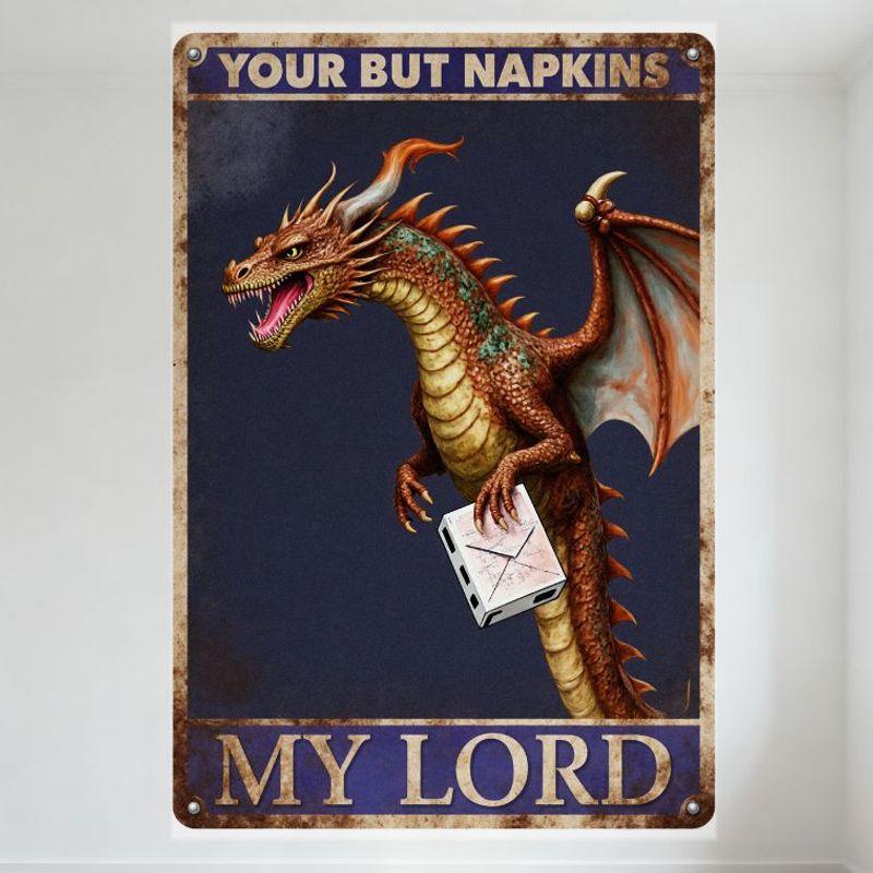 Vintage Dark Blue Metal Sign with Dragon Holding Napkin Dispenser - YOUR BUT NAPKINS & MY LORD Humorous Fantasy Decor for Bar Ma