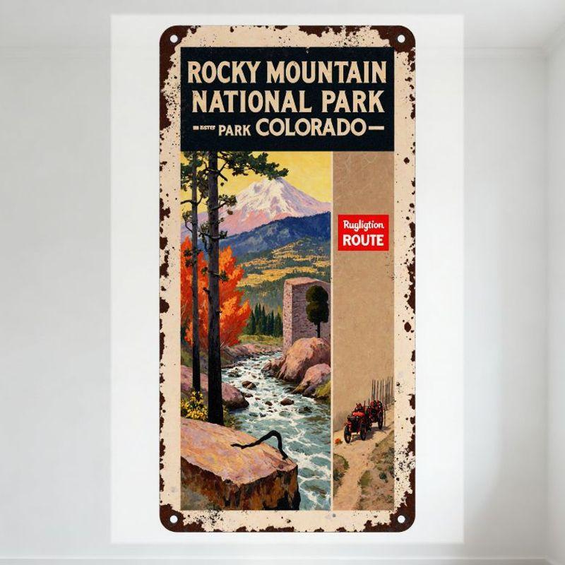 Vintage Rocky Mountain National Park Metal Sign Colorado Rustic Pine Trees River Stone Tower Horse Carriage Wall Plaque Home Bar