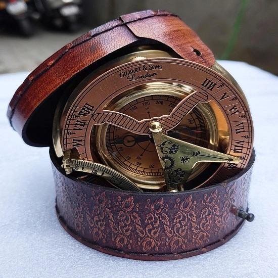 Brass Sundial Compass with Handmade Leather Case Nautical Navigation Tool Unique Gift