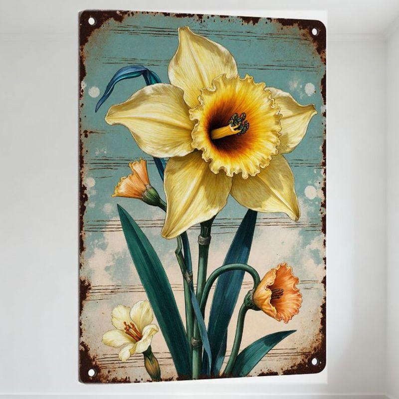 Vintage Rustic Metal Tin Sign with Yellow Daffodils & Blue-White Wood Pattern for Home Decor, Man Cave, Cafe, Bar