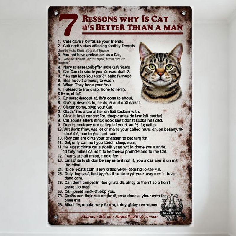 Vintage Humorous '7 Reasons Why a Cat Is Better Than a Man' Metal Tin Sign with Rusty Finish, Tabby Cat Illustration - Home Bar