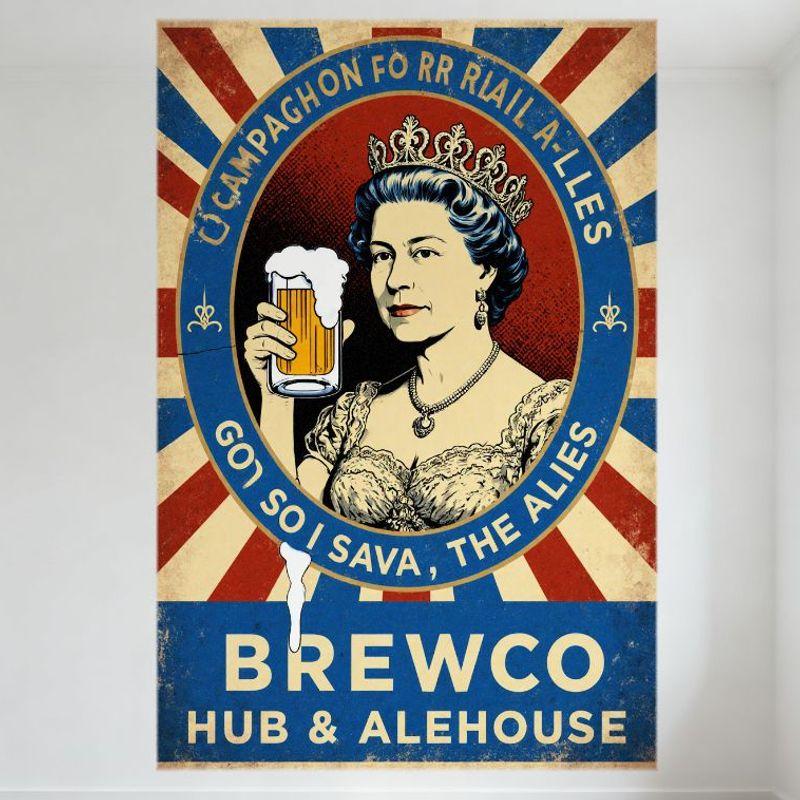 Vintage Queen Elizabeth II Beer Propaganda Metal Tin Sign, Retro Union Jack Radial Burst Wall Art for Bar Pub Man Cave Home Deco