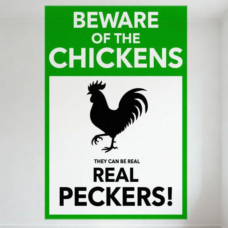 Beware of The Chickens Metal Tin Sign with Rooster Silhouette - They Can Be Real Real Peckers! Vintage Funny Warning Sign for Ho
