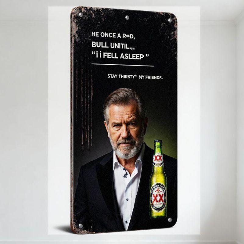 Vintage Rustic Metal Tin Sign with Gray Bearded Man & Modelo Beer Bottle, Weathered Aged Dark Background, ‘STAY THIRSTY MY FRIEN