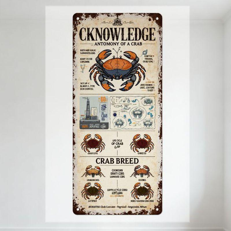 Vintage 'Anatomy of a Crab' Metal Tin Sign, Rustic Weathered Antique Wall Decor with Crab Illustration, Educational Seafood Art