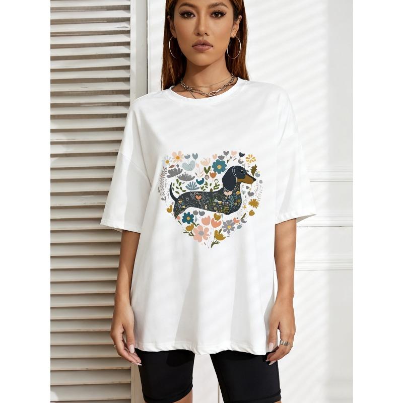 Women Casual Oversized T Shirt White Dachshund Floral Heart Print For Everyday Wear And Leisure Activities