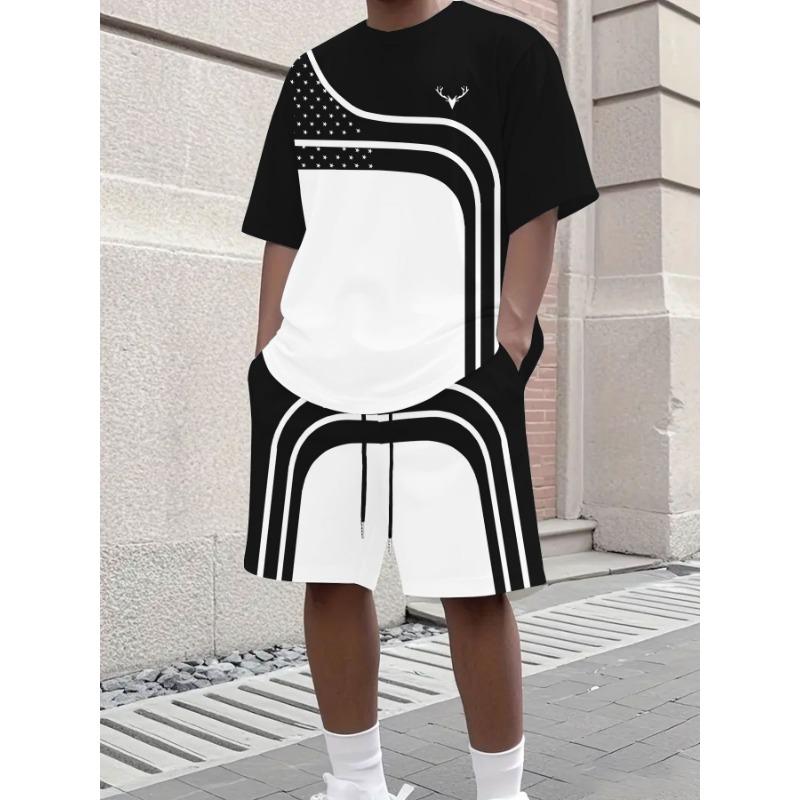 Men's 2-piece Printed Round Neck T-shirt and Drawstring Shorts for Summer Sports