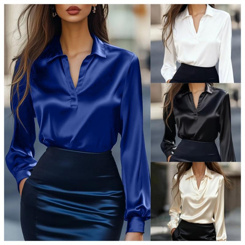 Spot 2025 New Autumn Fashion Commuter Satin V-neck Long-sleeved Shirt Shirt