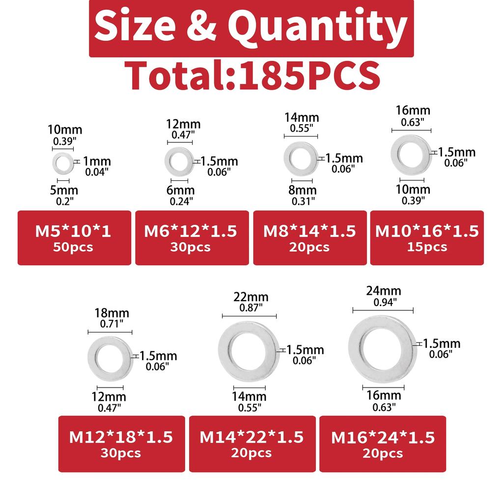 185pcs Aluminum Flat Washer Assortment Kit Aluminum Flat Washers M5 M6 M8 M10 M12 M14 M16 Washer Flat Ring Gasket Rings