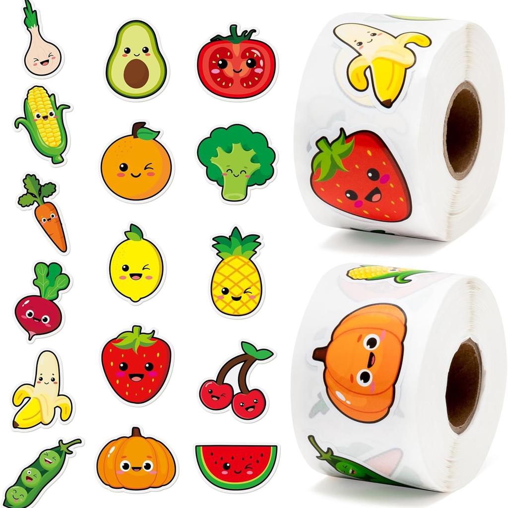 500pcs Roll Stickers Colorful Fruits Vegetables Smiling Face Children Strawberry Banana Watermelon Orange Pumpkin Reward Sticker