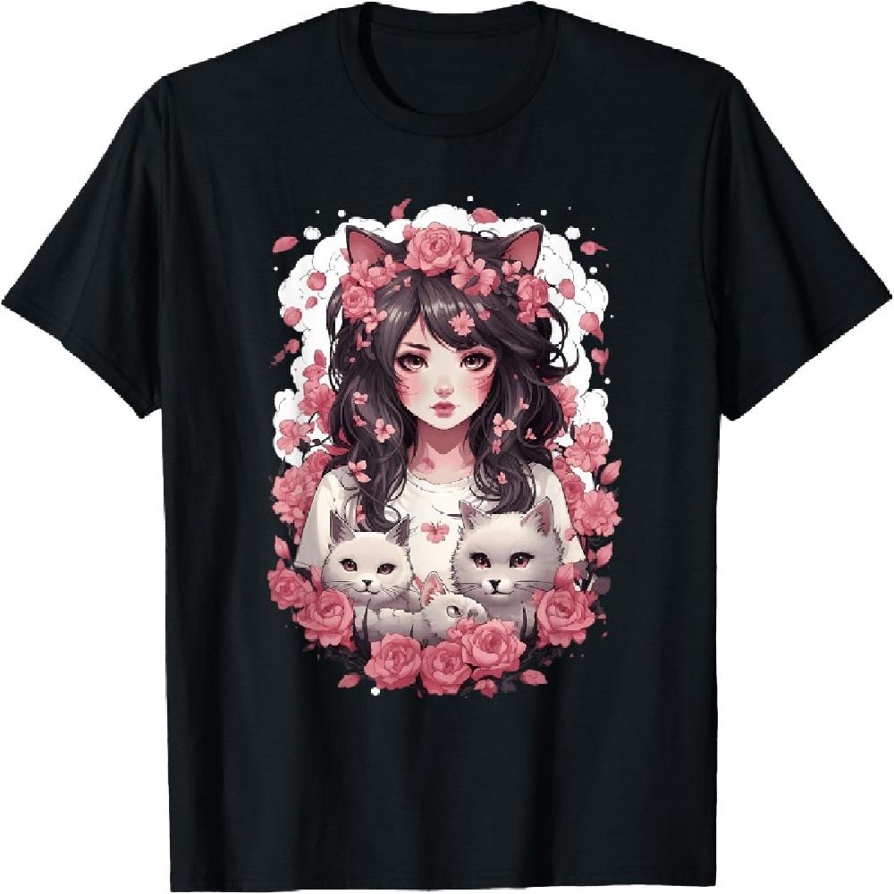 Cherry Blossom Butterfly Anime Girl With Kawaii Cat T-Shirt