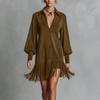 Women's Long Sleeved Casual Retro Loose V-Neck Suede Tassel Dress