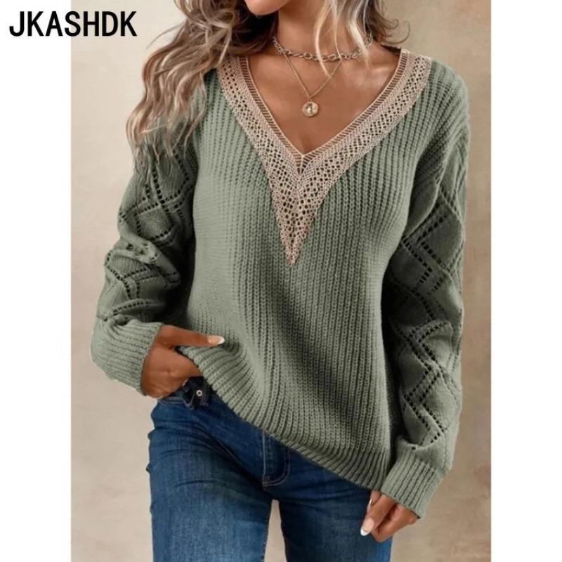 JKASHDK Women's Fashion Casual Fall Winter Solid Color Print Long Sleeve V-Neck Sweaters