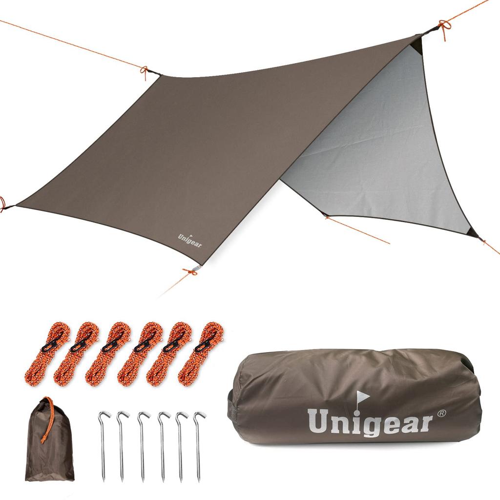 Water-repellent and UV-resistant: The Unigear camping tarp is made of PU-treated material, with a water resistance of 3000mm, making it resistant to heavy rain. The seams are also taped to prevent leaks; the back is coated with a silver coating to block UV rays, ensuring comfort even in hot weather.