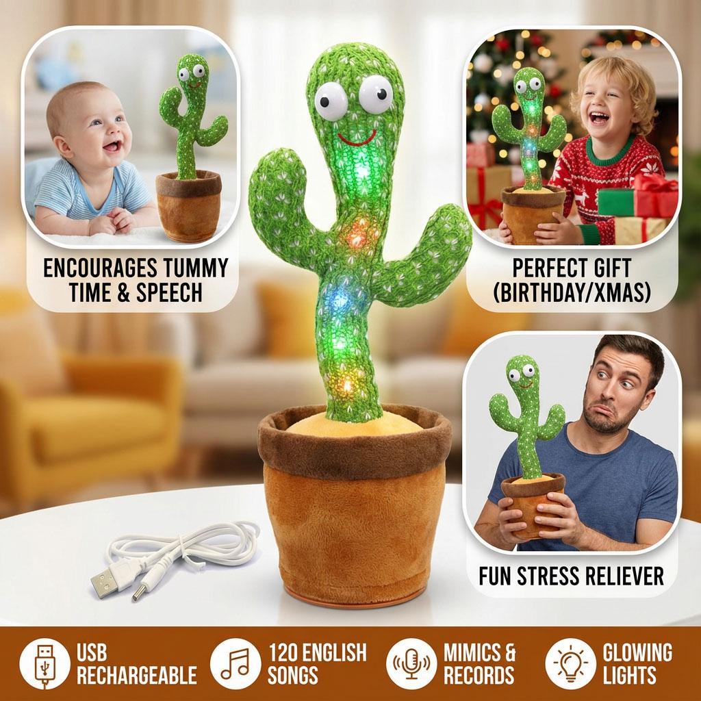 Singing & Dancing: Built-in 120 Built-in Cheerful Melodies. The cactus twists its body and waves its arms to the rhythm of the music, which stimulates children's visual and auditory interest.