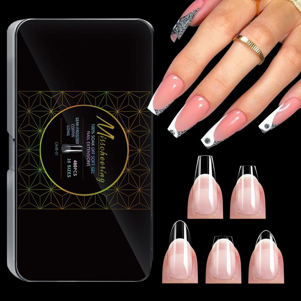 New Soft Gel False Tips 480pcs Almond Square Coffin French Half Frosted Fake Press On Acrylic Nails Full Cover American Capsule