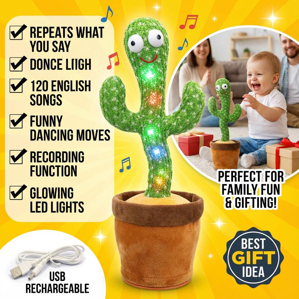 This cute and funny dancing cactus toy is the perfect companion for children and a hilarious stress-reliever for adults. It can sing, dance, twist, and repeat what you say in a funny voice. With colorful LED lights, it creates a cheerful atmosphere for parties and home decoration.