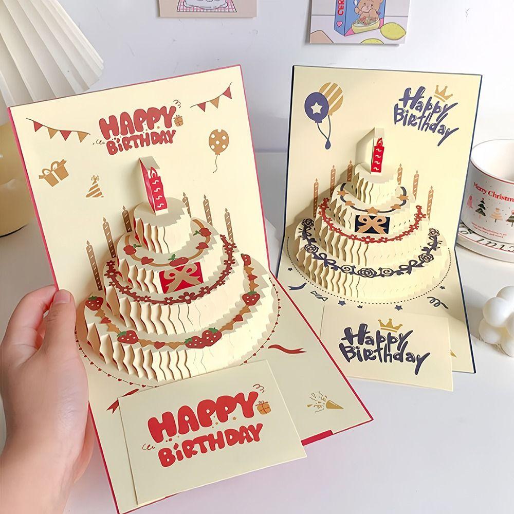 -3D Pop-Up Cake Design:This birthday card features a stunning, multi-layered pop-up cake (with decorative details like strawberries, ribbons, and candles) that springs to life when opened--creating a vivid, festive surprise for the recipient.