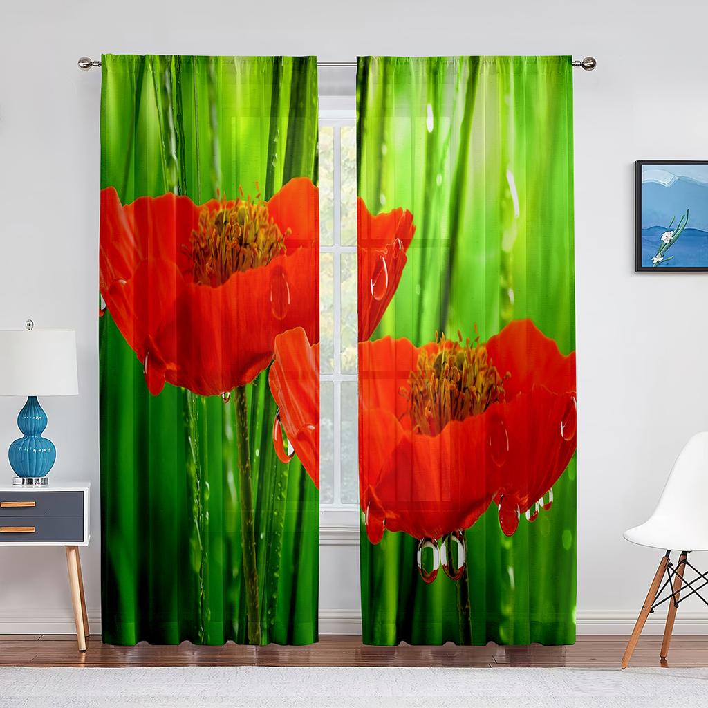 Poppy Flower Red Floral Sheer Voile Curtains for Living Room Bedroom Kitchen Tulle Window Curtain Home Decoration Chiffon Drapes