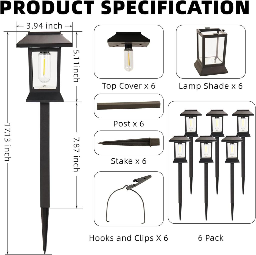 6 Pack Solar Path Lights Outdoor Waterproof, Dual-Use Stake/Hanging, 17' Warm White 3000K, 1000mAh Battery & Monocrystalline Pan