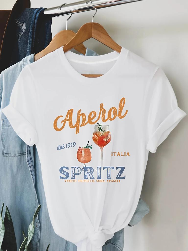 Casual Top for Summer & Spring Women's Clothing Aperol Spritz Letter Print T-shirt Sleeve Crew Neck Short Sleeve Tops Tees
