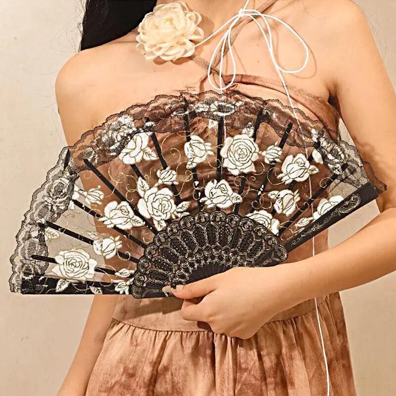 Chinese Style Folding Fan Lace Dance Fan Photo Props Embroidered Decorative Hand Fan Ornament Wedding Party Favor Gift Hand Fan
